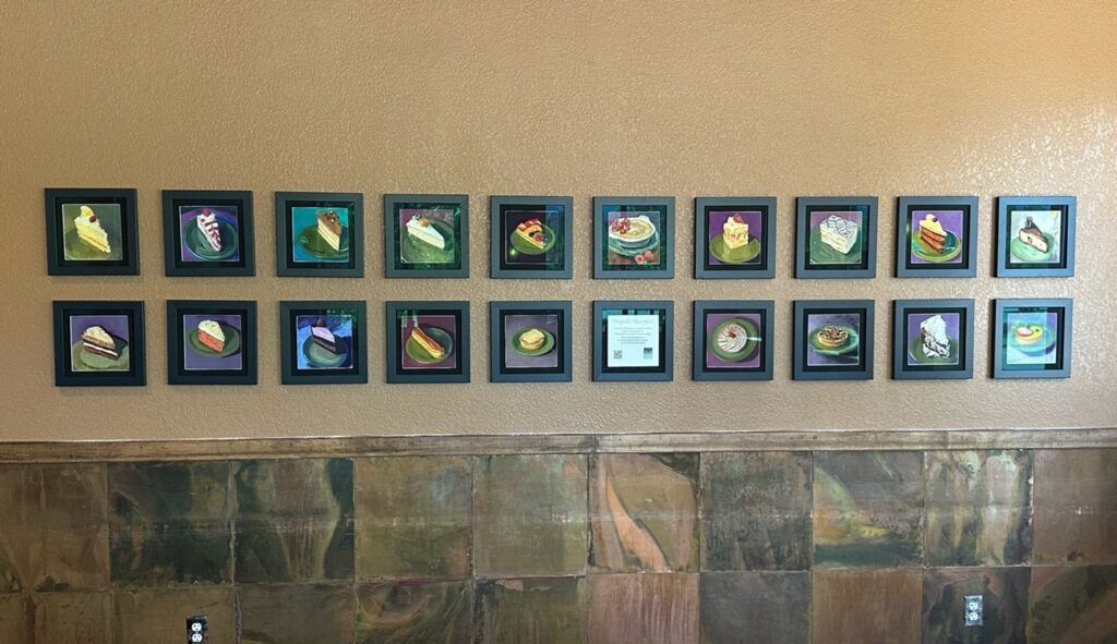 The owners allowed us to hang a sign with our name and website address on it to let restaurant patrons know who the artists are and how to reach us. There is also a QR code on the sign that takes the viewer directly to a page with photos of the paintings and the name of the artist that painted each dessert.