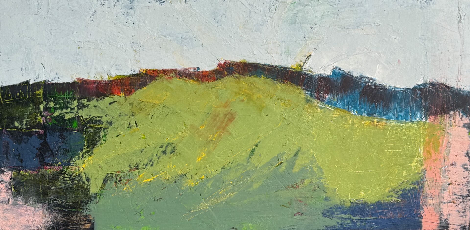 The Colorado mountains call to me. Their rugged shapes and changing colors stay in my mind. This painting reflects the greens and pinks and shapes of one such landscape.